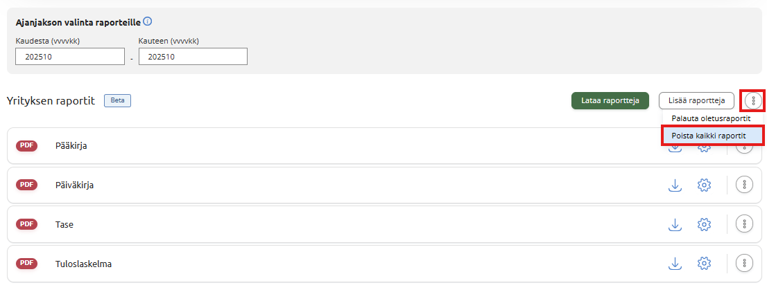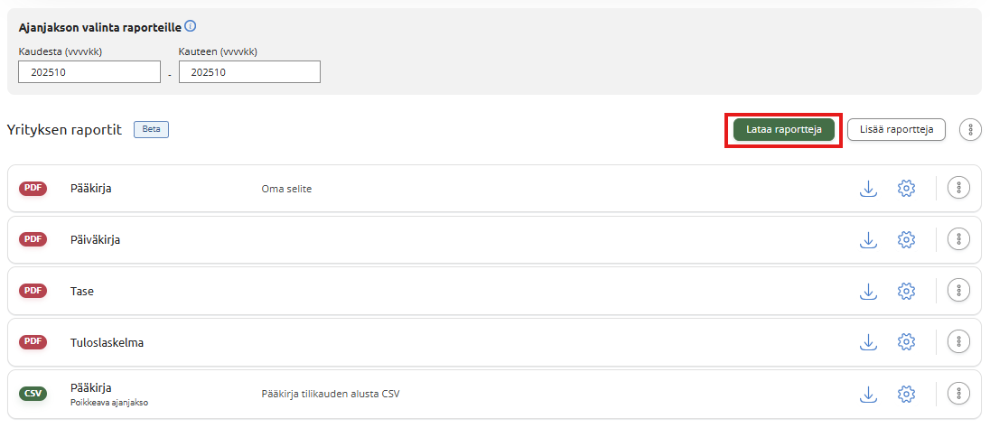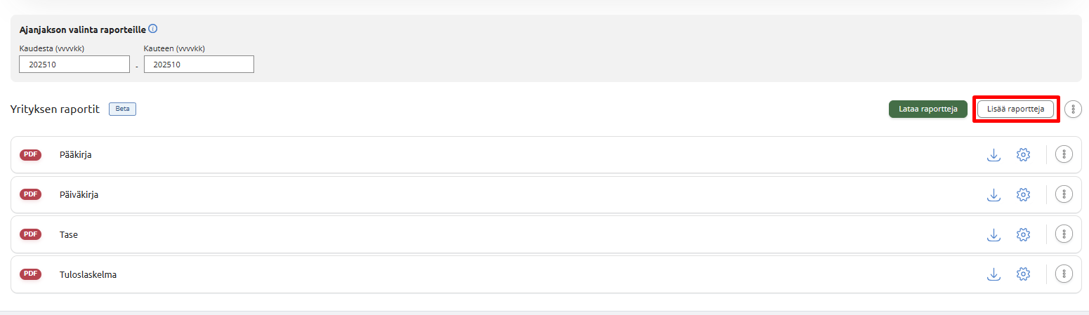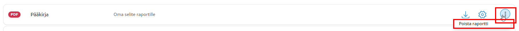 Näkymään lisätyille raporteille löytyy rivin lopusta omat raporttikohtaiset toiminnot, joilla voit ladata, muokata ja poistaa raportin.