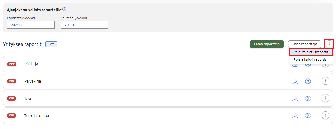 Pääset palauttamaan oletusraportit valitsemalla raporttien oikeasta yläkulmasta kolmen pisteen painiketta ja valitsemalla Palauta oletusraportit.