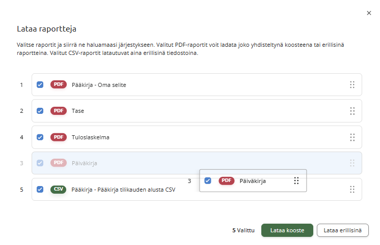 Valitse avautuvassa ikkunassa raportit, jotka haluat ladata ja siirrä ne haluamaasi järjestykseen raahamalla ne hiirellä haluamaasi kohtaan: