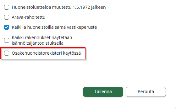 HTJ integraatio päätetään poistamalla täppä "Osakehuoneistorekisteri käytössä" Taloyhtiön perustiedoista. Taloyhtiön perustiedot löytyvät Fivaldi webistä Kiinteistöhallinta -> Kiinteistöhallinnan asetukset -> Taloyhtiön perustiedot.